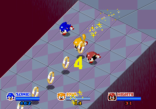 - エッグマンに捕まったソニックたちの脱出劇を描くクォータービューアクション。 ソニックを主人公に、レイ、マイティーというオリジナルキャラも登場する。 トラックボールによる操作とジャンプボタンを駆使してトラップを回避しながら進んでいく。走りながらジャンプすると回転アタックになり、敵に体当たりできる。全7ステージ。