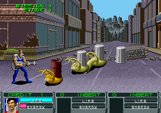 - プレイヤーキャラクターは、普段屋台でホットドックを売っている「GORDON」「KARLA」「SCOOTER」の3人。 エイリアンが出現すると、彼らは優秀なエイリアンバスターズに変身する。 エイリアンとプレイヤーの闘いのストーリーに合わせて、通常のアクションシーン、爽快感溢れる3Dシューティングシーン、高速スクロールシーンで展開するアクションが交互に展開。3Dシューティングシーンでは、ゲーム画面内の壁や棚、品物など全て破壊可能で爽快感抜群。ボタンはそれぞれ攻撃、前転、エネルギーを消費しての全体攻撃。複数のステージに分かれた全6ミッション構成となっている。 【プレイヤー・ボイス】 やはり当時のセガセンス爆発なエイリアンストーム。最終的には1コインクリアしたであるよ(´ω`) 一度だけこれまで出たことの無いスコアが出てメストにハイスコア申請したけれど、掲載店10店未満で幻の全国トップな思い出(´・ω・`) neesarijityou