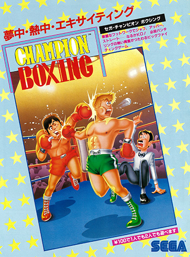 横視点のシンプルなボクシングゲーム。 ボタンでジャブ、アッパー、ストレートの3種のパンチを選択、レバーの上下で顔面とボディへ打ちわける。ダメージを食らうと画面下の疲労度ゲージが青→黄→赤と変化していく。1P時は3ラウンドで、ノックアウトまたは得点による判定で勝負を決定。2P時は対戦となり、5ラウンドで勝負する。