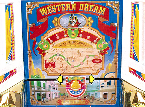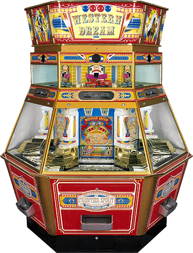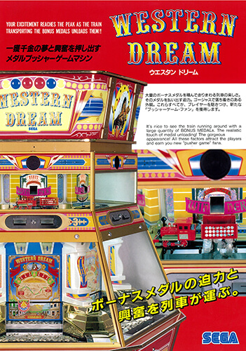 一攫千金。夢と希望を載せた列車が西部へと向かう。 この熱い想いを込めたプッシャーゲームマシンの登場。ポケットを狙い、メダルを落とす。ルーレットが作動し、駒が進む、すごろく的なおもしろさ!