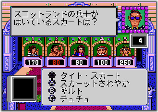 クイズ番組の出場者となって優勝をめざす、最大5人の対戦プレイも楽しいクイズゲーム。番組の進行に沿ってさまざまな形式のクイズが楽しめます。 ※問題は、1993年6月に作成されたものです。