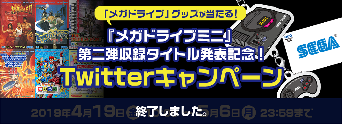 セガ公式Twitterアカウント@SEGA_OFFICIALをキャンペーン期間中にフォロー&応募用ツイートをリツイートしてくださった方の中から、抽選で3名様に、「『メガドライブ』連結キーホルダー」と「セガロゴQUOカード」セットをプレゼント!