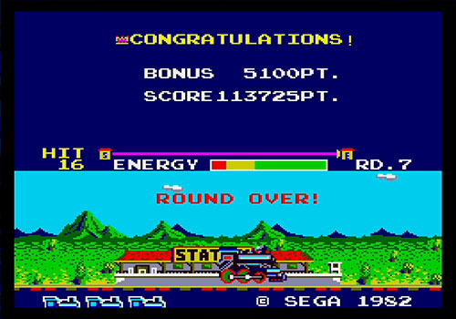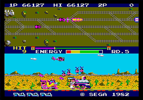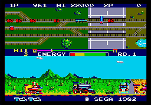 線路を走り続ける機関車を操作して、敵の攻撃を避けながら、駅を目指して走る異色アクションです。上下2つに分かれた画面をうまく使って、汽車のコースを変えたり、敵を攻撃したりできます。1982年のアーケードゲームを、初めて移植しました。