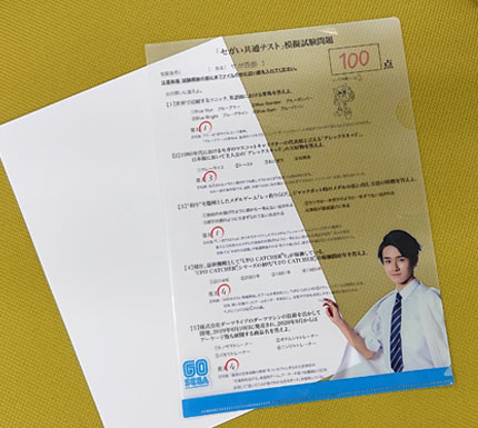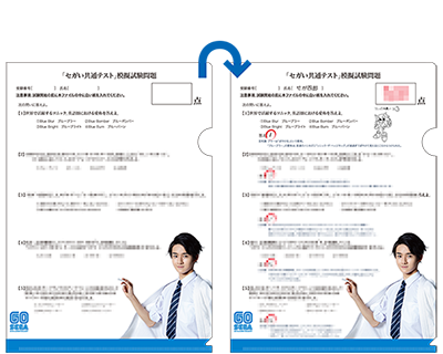 「セガい共通テスト」の模擬試験にいち早く挑めるクリアファイルとGO SEGAペンのセットです。選び抜かれた予想問題9問にチャレンジできるクリアファイルは、中に入っている白い紙を抜くと解答と解説が現れ、答え合わせをすることができます。目指せ満点!