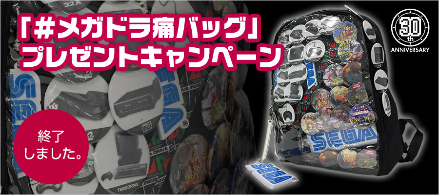 メガドライブ30周年記念!本キャンペーン期間中、セガ公式Twitterアカウント@SEGA_OFFICIALをフォローして、指定の応募用ツイートをリツイートした方の中から抽選で、1名様に「#メガドラ痛バッグ」をプレゼント!