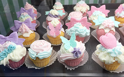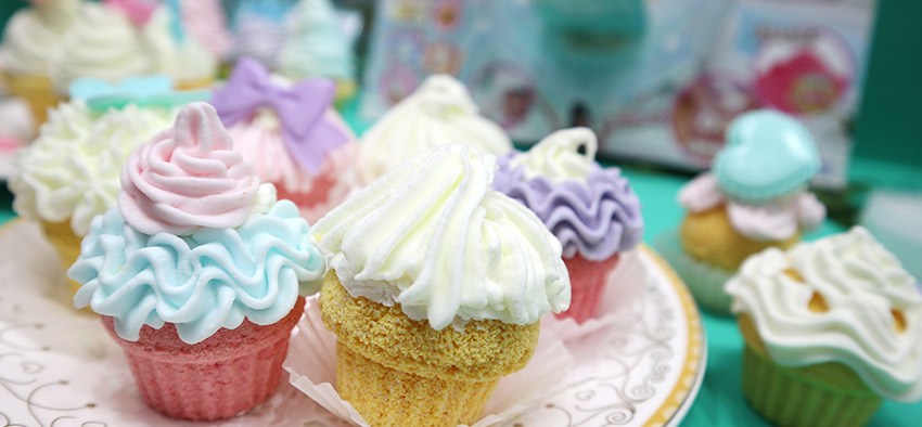ケーキ屋さんをモチーフにしたショーウィンドウには、かわいいカップケーキが並んでいて味見したくなっちゃいますが、実は『しゅわボム』は本物のスイーツみたいなバスボムが作れる手作りキットです。