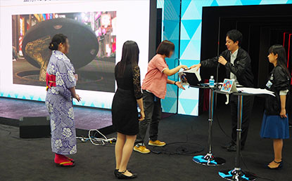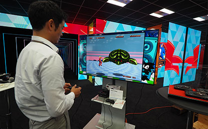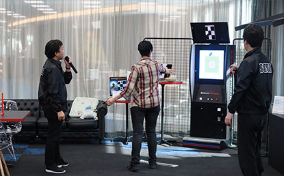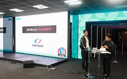 続いて、セガグループの最新コンテンツの先行体験会を開催。セガグループより「ダーツライブ」社の新作『ニンジャトレーナー アーケード』を開発スタッフの田中さん自ら紹介。話題沸騰中の日本忍者協議会唯一の公認である手裏剣ボード『ニンジャトレーナー アーケード』が一体どんなコンセプトから誕生したのか?から、海外の方の忍者への認知度(なんと99.8%!)やゲームのおもしろさなどをプレゼンし終えると、新感覚過ぎるニンジャゲームに多くの参加者が体験を希望していた。アイエエエ!
