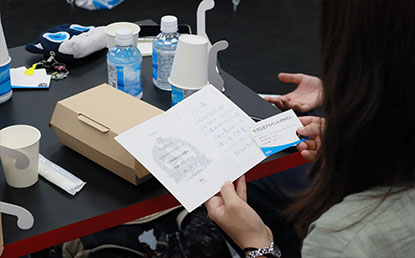 参加者がテーブルに座ると、各人に向けて個別に用意されたウェルカムカードが。なんと、1枚1枚に手書きでメッセージが添えられており、もちろん参加者ごとに違う内容となっているこだわりっぷり。万年筆で描かれたソニックっぽい何かのイラストが輝いている逸品。