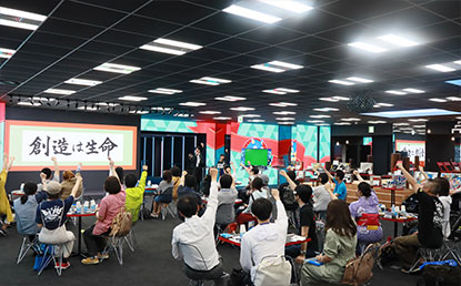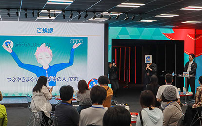 オープニングの挨拶がはじまると、早速セガグループの企業理念である「創造は生命(いのち)」を一同で唱和。続いて、セガ公式Twitterアカウントの中の人(本体)がお面姿で現れ、集まってくれた参加者へのお礼と日ごろの感謝を述べた。