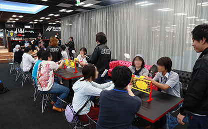 試合では、椅子から立ち上がるどころか転げ落ちる人が続出するほど大盛り上がり。隣のテーブルに突撃する勢いでハネを拾いに行く人もおり、白熱した試合が各所で見受けられた。ついさっきまで初対面で、挨拶すらまだ交わしていない参加者もいたのに『ケツミントン』効果で一気に一体感と熱気むんむんの会場。スタートダッシュは大成功だ。