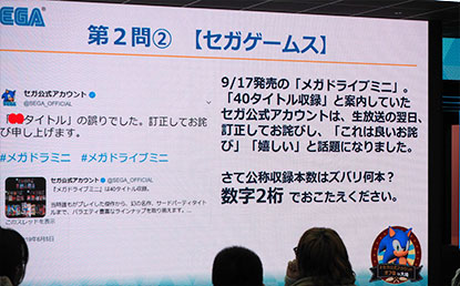 続いて、「セガ公式アカウントクイズ」を開催。効果音は知る人ぞ知るセガのクイズゲーム『Answer×Answer』から。