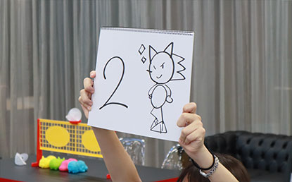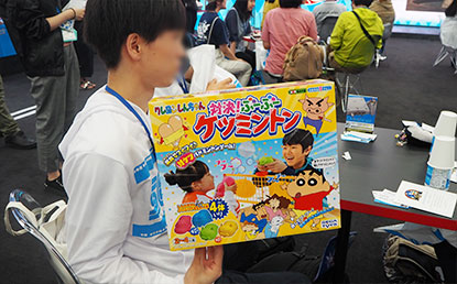 まずは全員がほぼ初対面同士である、ということで、ちょっとでも参加者に打ち解けてもらいたい、そこでわれわれがセガトイズの倉庫から出してきたのが、(前回に引き続いて)セガトイズ『クレヨンしんちゃん 対決!ぶーぶーケツミントン(以下、ケツミントン)』だ。