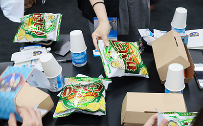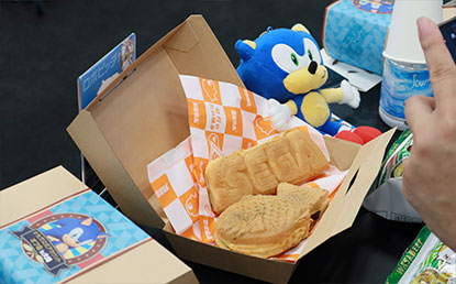 ここで、頭と身体を使ってカロリーを消費した参加者のみなさんに、おやつタイム! 「セガロゴ焼き」と「セガのたい焼き」、さらに協賛いただいた山芳製菓さんご提供の「わさビーフ」をセットにした「フィッシュアンドチップス」をギブアンドギブ! Twitterでネタにしていた組み合わせに気が付いた参加者たちが、ニヤリと笑いつつ写真を撮っている姿が多く見受けられた。