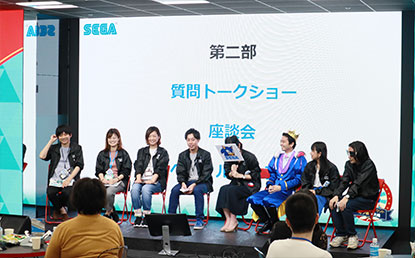 休憩時間を挟んで、セガ公式Twitterアカウントの中の人を筆頭に、各タイトル・サービスのアカウントの中の人や運営スタッフ、UFO王子が登壇し「質問トークショー」コーナーへ。