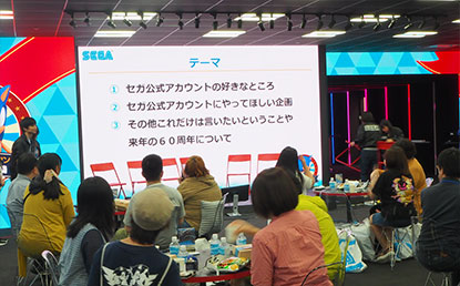 そのまま、各スタッフがそれぞれのテーブルに混ざってお話しする「座談会」コーナーに突入。「セガ公式アカウントの好きなところ」など3つのテーマを決めてのお話コーナーで、ここぞとばかりに熱い思いをぶつけている参加者がいっぱいいらっしゃった。「あ、このテーブルの熱量めっちゃ高い」「これは中の人返答難しいぞ!」など無責任に思いつつ自分は運営スタッフとして遠巻きに眺めているだけだったが、正直混ざりたいくらい楽しそうな空間だった。テーブルからは来年60周年に向けてやってほしいことや「セガ公式アカウントの中の人が描くゆるいアレのグッズ化」などマニアックな要望もあったという……。