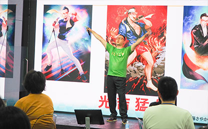 大音量で『デイトナUSA』の「LET'S GO AWAY」が流れると、会場後ろのカーテンが開き、セガの日本一歌のうまいサラリーマン 光吉猛修サウンドディレクターが登場!
