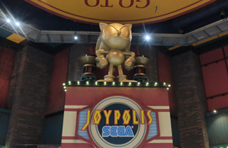 岡山ジョイポリスの正面入り口上には店内を見渡すように金色に輝く黄金のソニック像が設置されています。